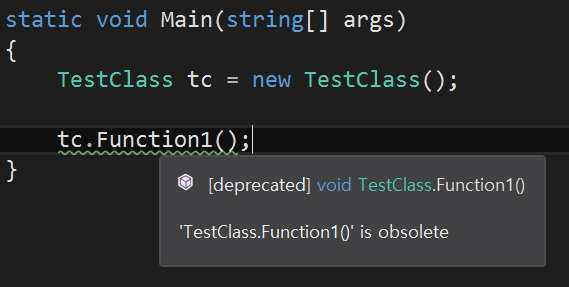 더 이상 사용하지 않거나 그럴 예정인 클래스나 함수, 변수의 앞에 [Obsolete] 어트리뷰트를 붙여주면 된다. 그렇게 하면 해당 함수를 호출할 때 초록색 밑줄과 함께 더 이상 사용하지 않는 함수라는 경고가 뜬다.